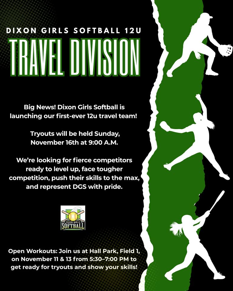 We are excited to announce tryouts for the Dixon Girls Softball 12U Travel Team for the upcoming season!