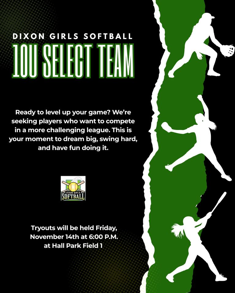 We are excited to announce tryouts for the Dixon Girls Softball 10U Select Team for the upcoming season! This team is a great intermediate transition for players moving beyond recreational softball who are ready to take their skills to the next level in a more competitive and focused environment.